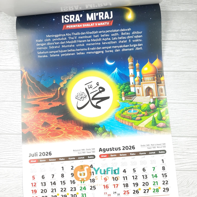 4. Lembar Juli - Agustus 2026 : Berisi tentang peristiwa Isra' Mi'raj Nabi Muhammad dan turunnya perintah shalat 5 waktu